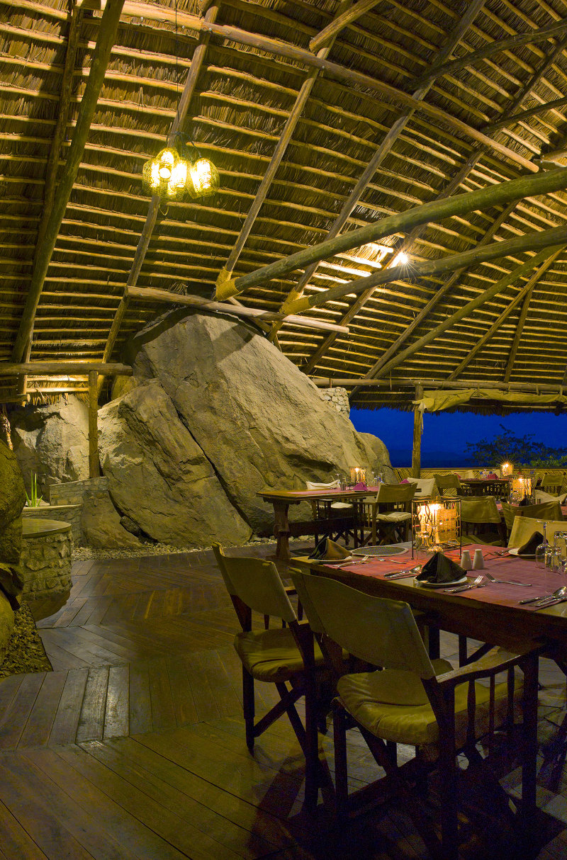 Les espaces communs sont intégrés à la roche du kopje, sous un impressionnant toit de chaume. Bar convivial, restaurant central pour 40 convives, salon perché et petit restaurant à flanc de rocher pour les groupes plus intimes : chaque recoin invite à la contemplation.
