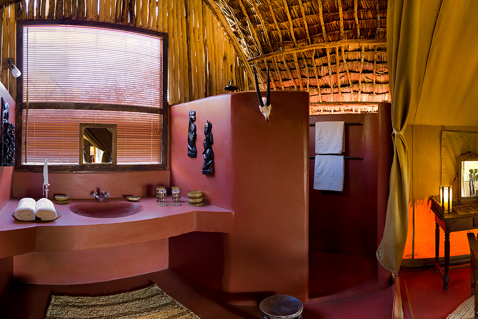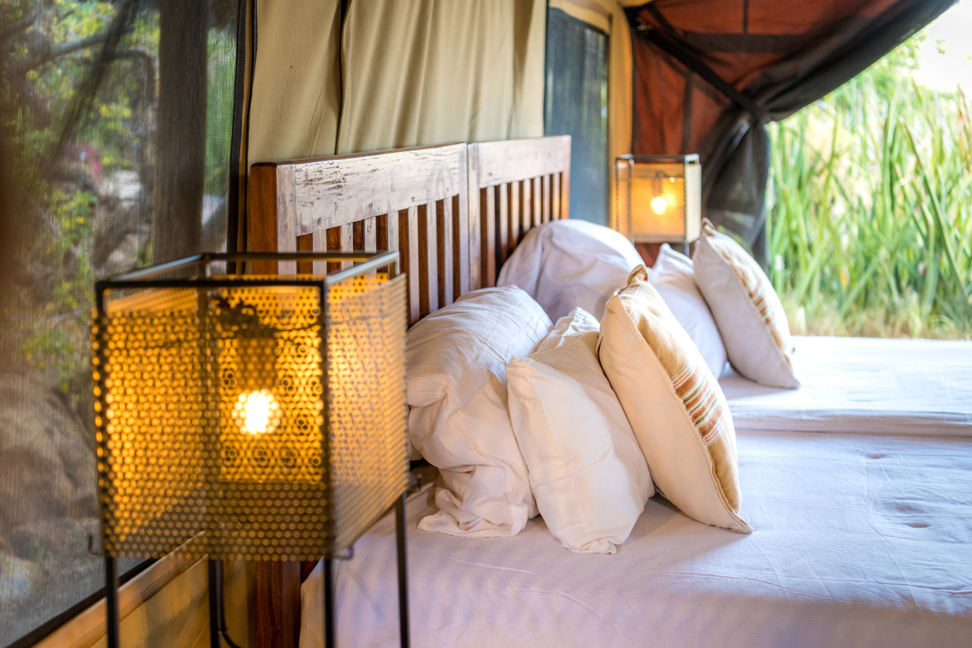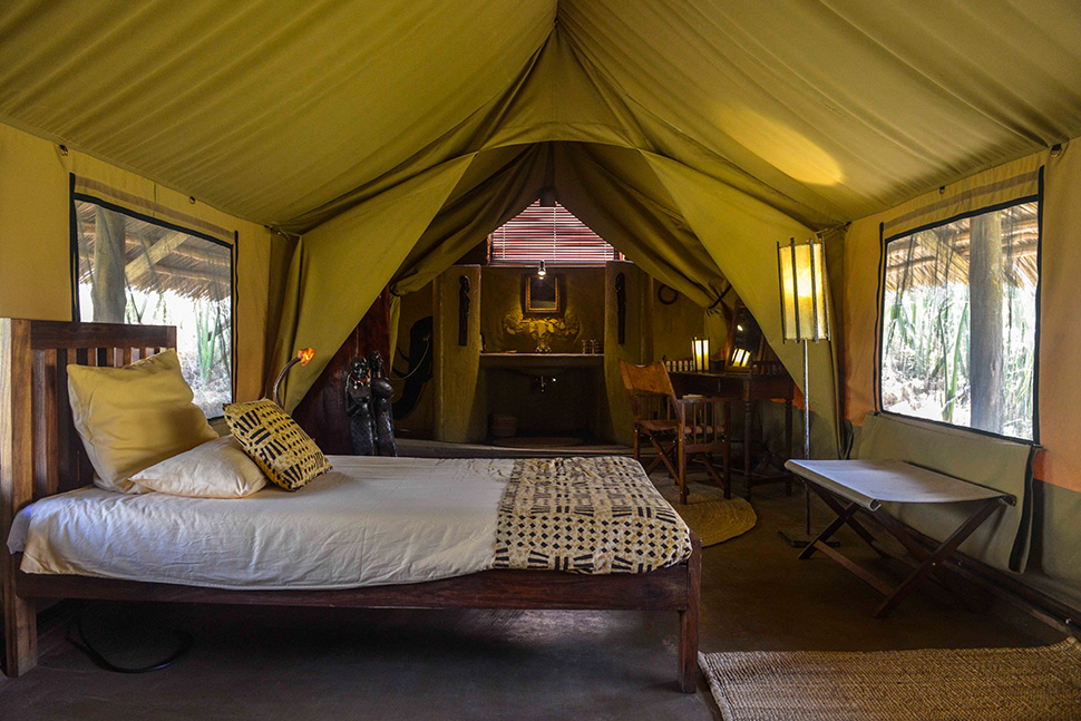 Chaque tente au toit de chaume mêle toile, bois et matières naturelles dans une élégance sobre, où le confort moderne ne trahit jamais l’âme de la brousse : grande chambre, dressing, salle de bain privative avec eau chaude solaire 24h/24, toilettes à chasse d’eau, terrasse privée.