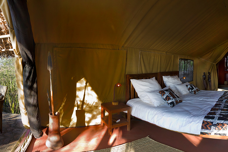 L’intérieur puise son inspiration dans les couleurs de la savane : ocres doux, beiges, verts fanés… chaque tente dégage une atmosphère unique.