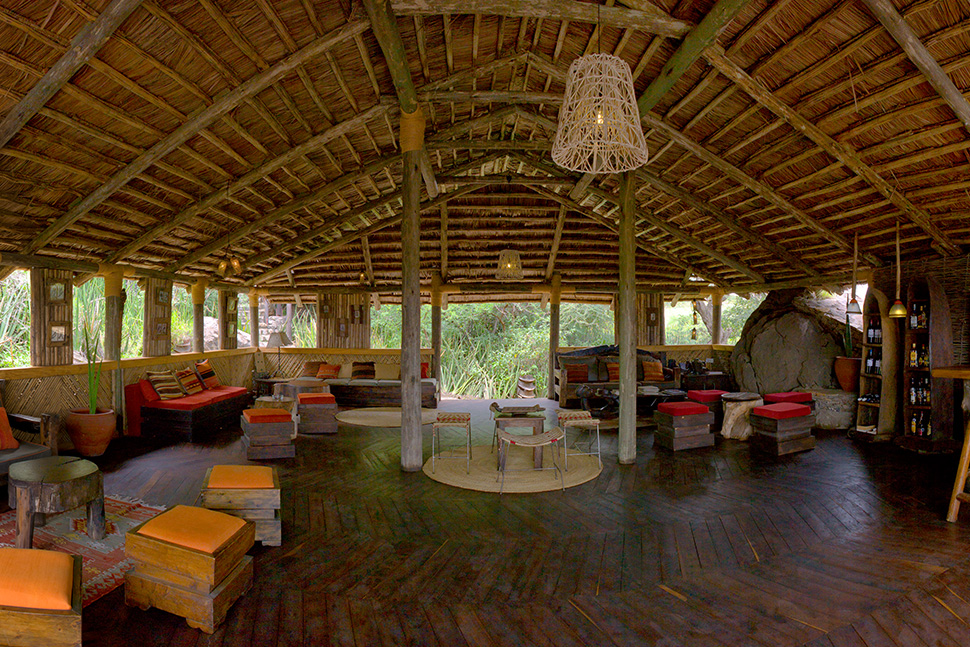 Les espaces communs sont intégrés à la roche du kopje, sous un impressionnant toit de chaume.